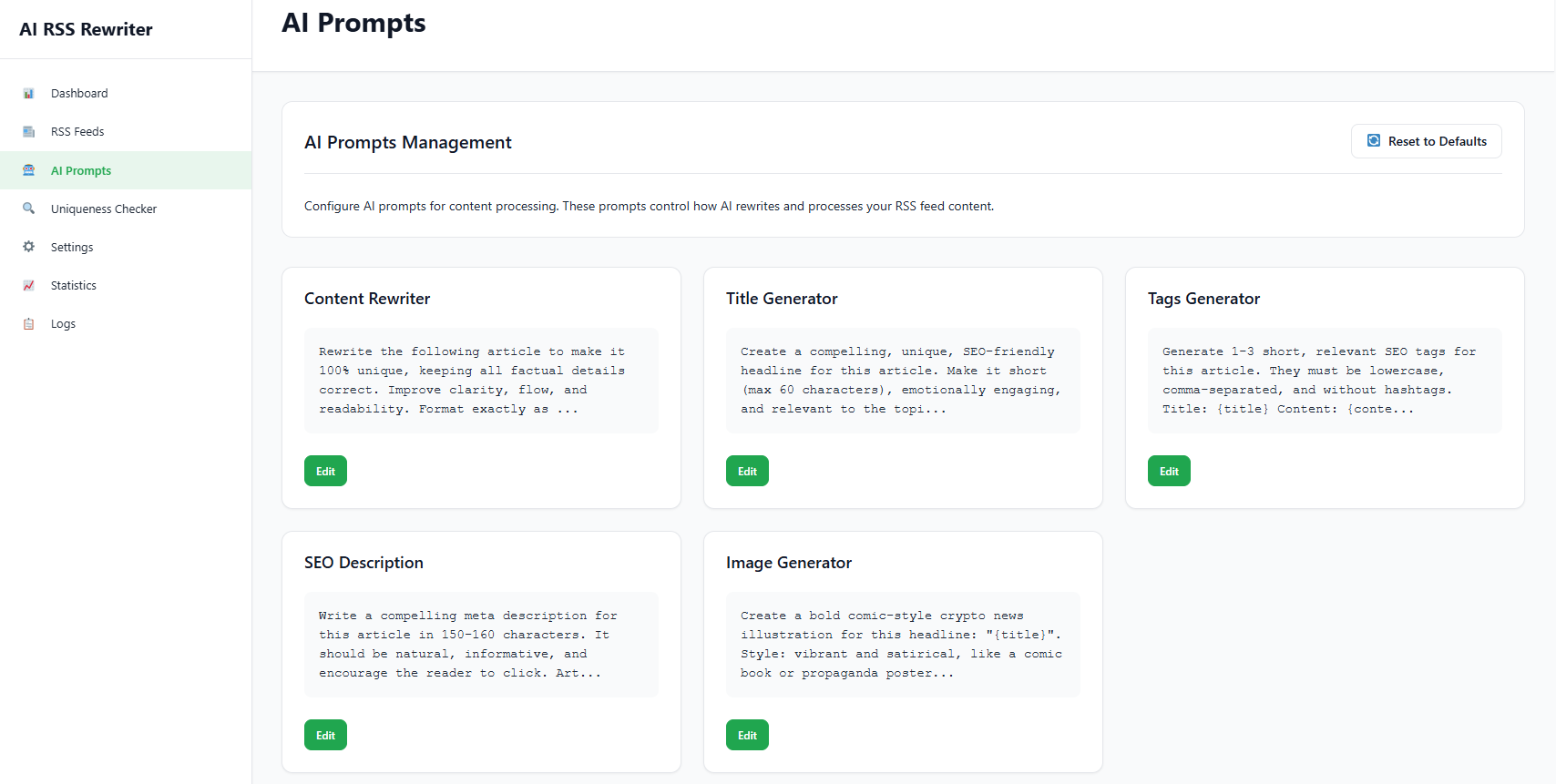- 🔄 AI Content Rewriting — Transform RSS content into unique articles using GPT-5 and GPT-4o models
