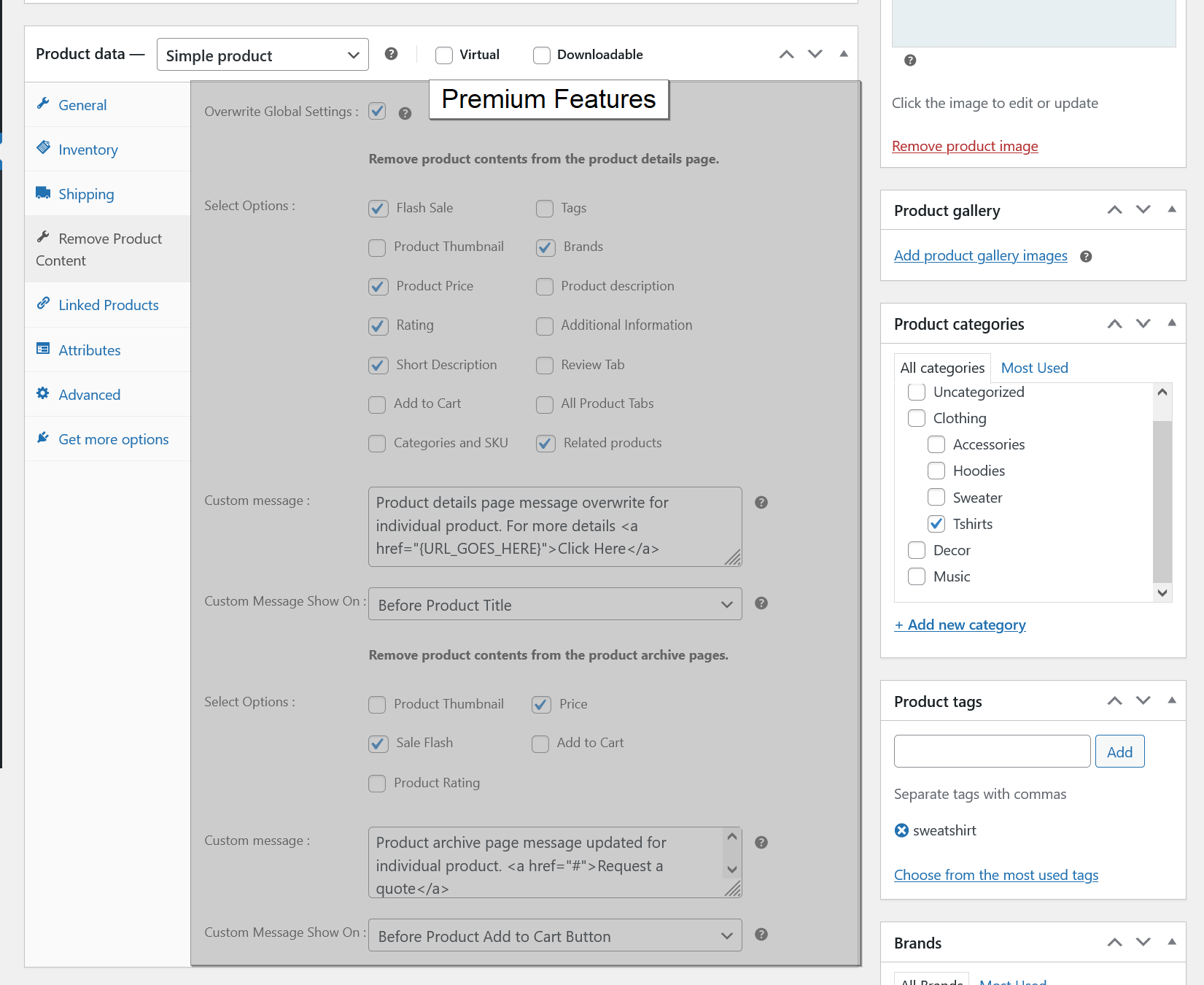Ideal for optimizing the product page layout, the plugin provides a user-friendly interface where admins can disable specific content like the Add to Cart button, product price, image, descriptions, short description, rating, reviews, tags, additional information fields, or related products, giving them full control over the page design.